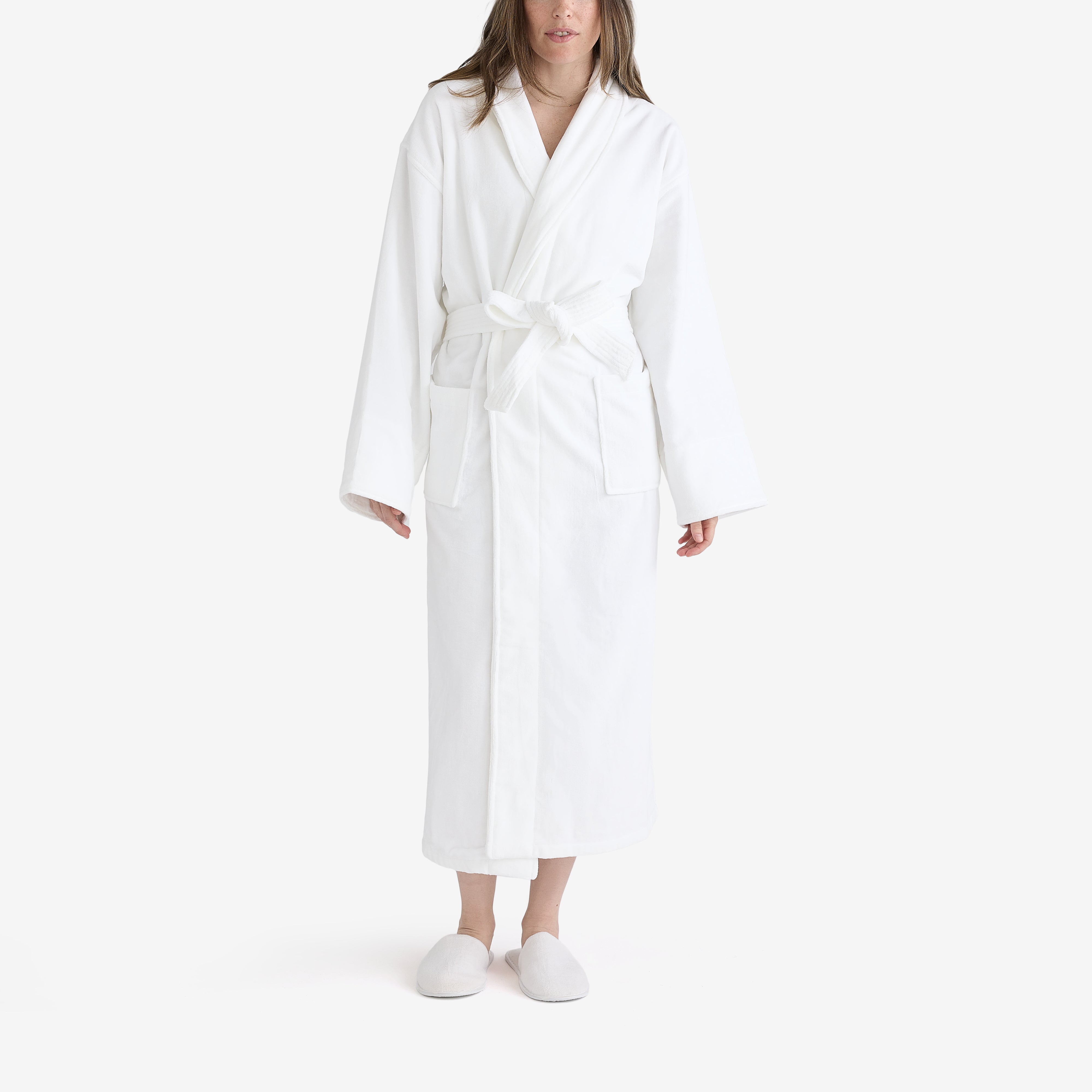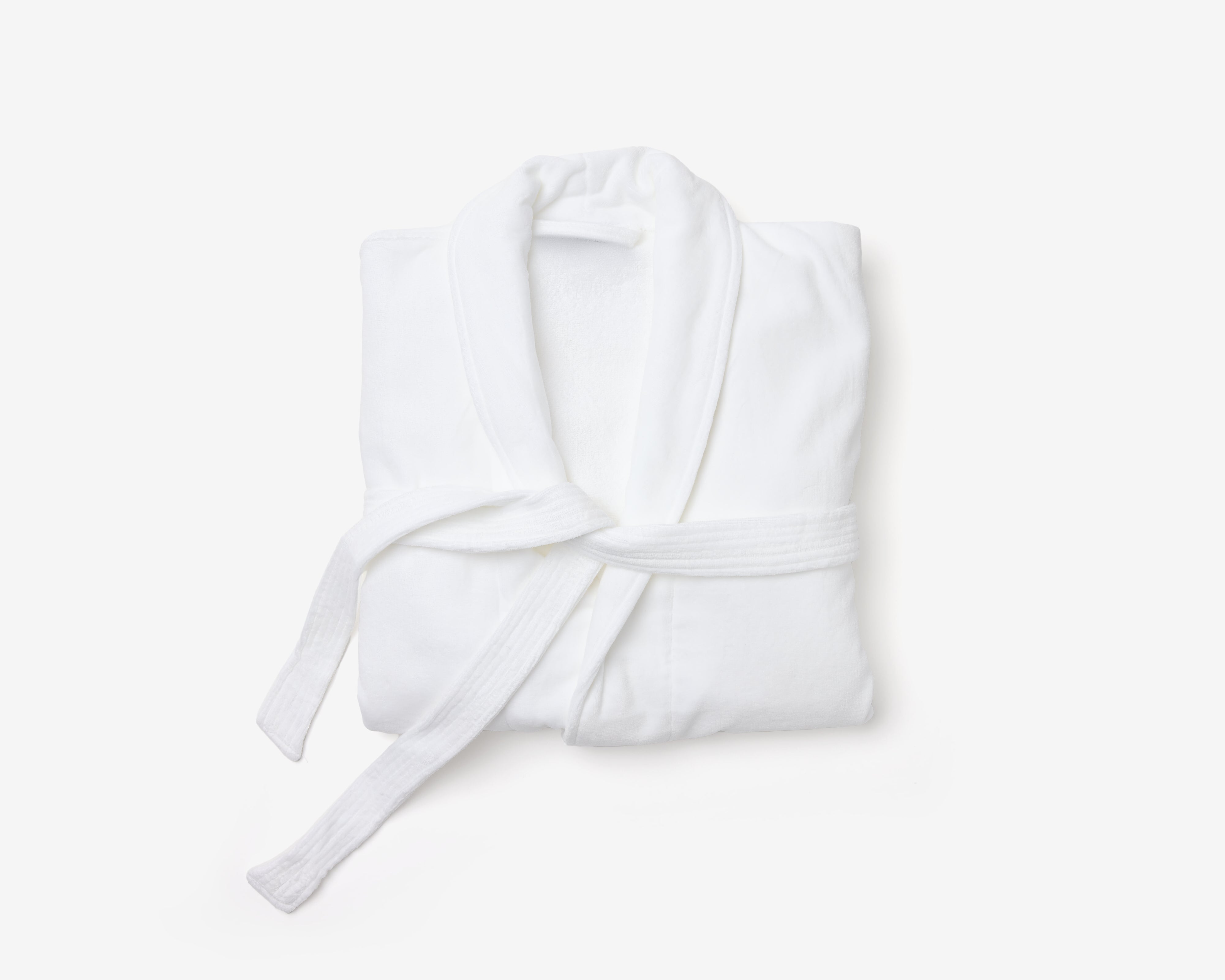 Relax at home in style and comfort with our classic cut Velour Bathrobe, made from 100% premium cotton. Elegantly styled with a velour shawl, this robe is velvety soft and snuggly on the outside with absorbent terry loops on the inside. Features two deep pockets and a velour waist tie with double belt loops.Features: